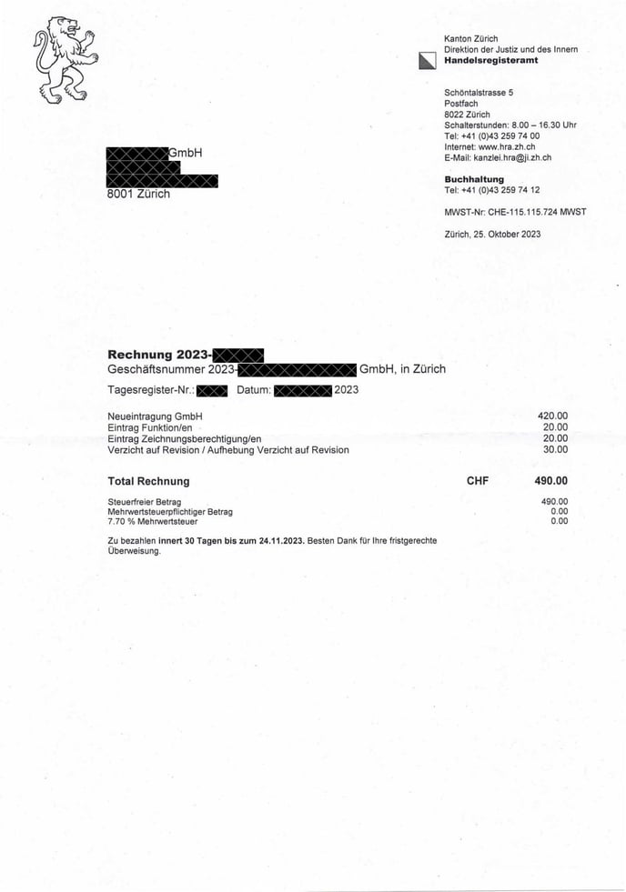 Einzig die Rechnung des offiziellen Handelsregisteramtes muss beglichen werden. Diese Rechnung sieht für den Kanton Zürich bspw. wie folgt aus: