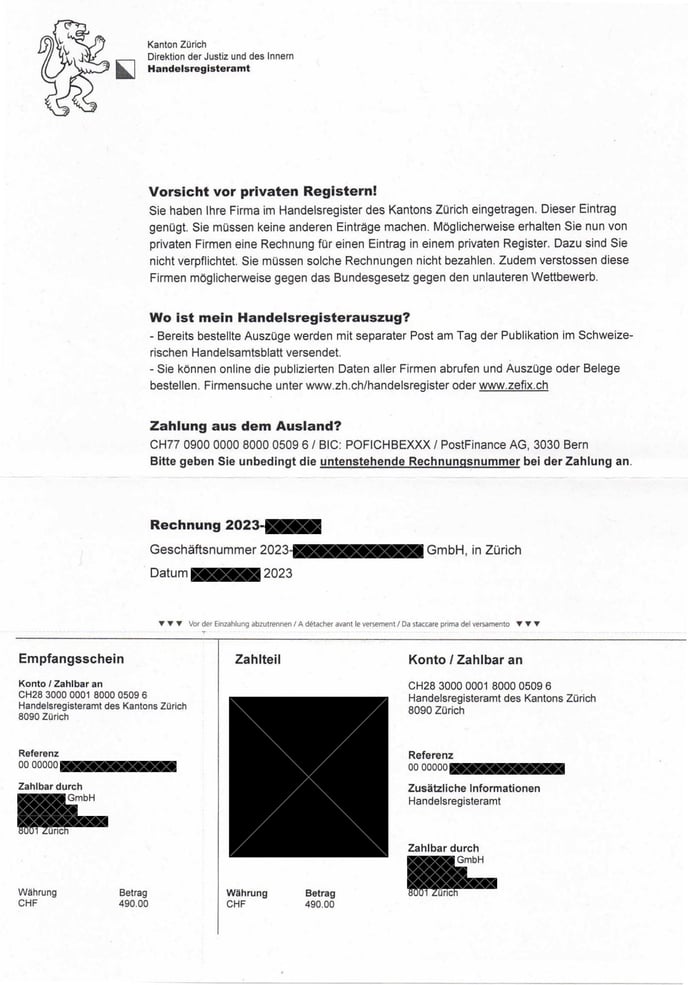 Nach Publikation Ihres Unternehmens im Handelsregister kommt es leider vermehrt zum Versand von irreführenden Rechnungen durch Betreiber von privaten Registern, Verzeichnissen etc. Dabei wird versucht, den Eindruck von offiziellen staatlichen Behörden zu erwecken. Lediglich im Kleingedruckten findet sich ein Hinweis, wonach das Schreiben ein Angebot sei und die Bezahlung der Rechnung eine Annahme des Angebots darstelle.